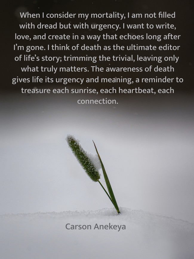 "When I consider my mortality, I am not filled with dread but with urgency. I want to write, love, and create in a way that echoes long after I’m gone. I think of death as the ultimate editor of life’s story; trimming the trivial, leaving only what truly matters. The awareness of death gives life its urgency and meaning, a reminder to treasure each sunrise, each heartbeat, each connection."