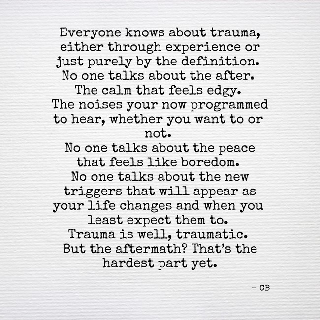 "Everyone knows about trauma, either through experience or just purely by the definition. No one talks about the after. The calm that feels edgy. The noises your now programmed to hear, whether you want to or not. No one talks about the peace that feels like boredom. No one talks about the new triggers that will appear as your life changes and when you least expect them to. Trauma is well, traumatic. But the aftermath? That’s the hardest part yet."