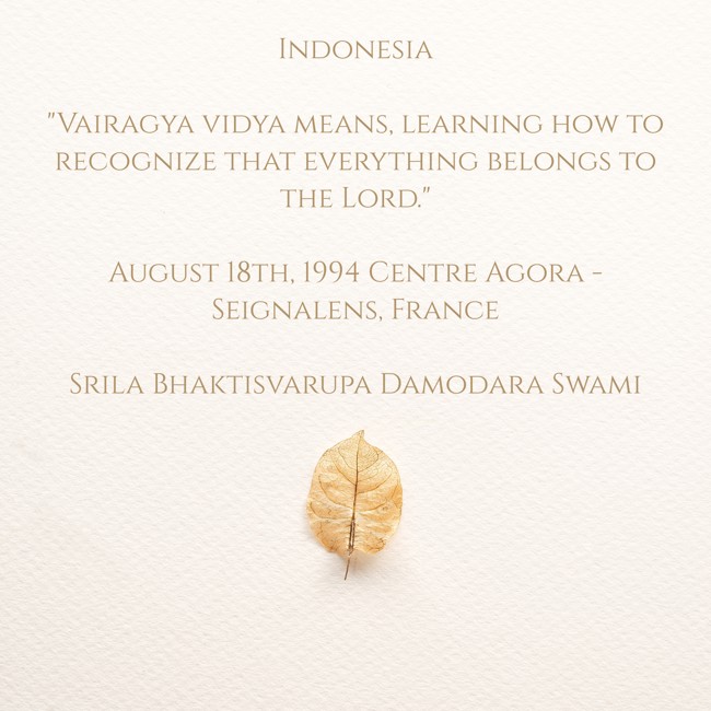 "Indonesia "Vairagya vidya means, learning how to recognize that everything belongs to the Lord." August 18th, 1994 Centre Agora - Seignalens, France Srila Bhaktisvarupa Damodara Swami"
