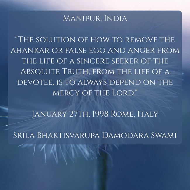 "Manipur, India "The solution of how to remove the ahankar or false ego and anger from the life of a sincere seeker of the Absolute Truth, from the life of a devotee, is to always depend on the mercy of the Lord." January 27th, 1998 Rome, Italy Srila Bhaktisvarupa Damodara Swami"