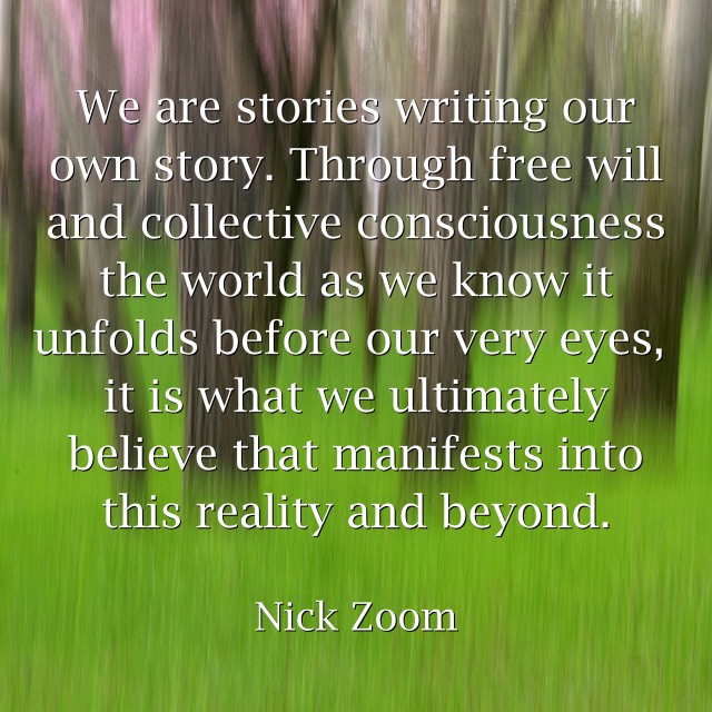 "We are stories writing our own story. Through free will and collective consciousness the world as we know it unfolds before our very eyes, it is what we ultimately believe that manifests into this reality and beyond."