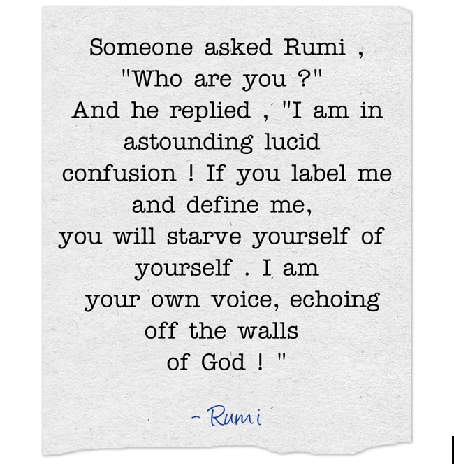 "Someone asked Rumi , "Who are you ?" And he replied , "I am in astounding lucid confusion ! If you label me and define me, you will starve yourself of yourself . I am your own voice, echoing off the walls of God ! ""