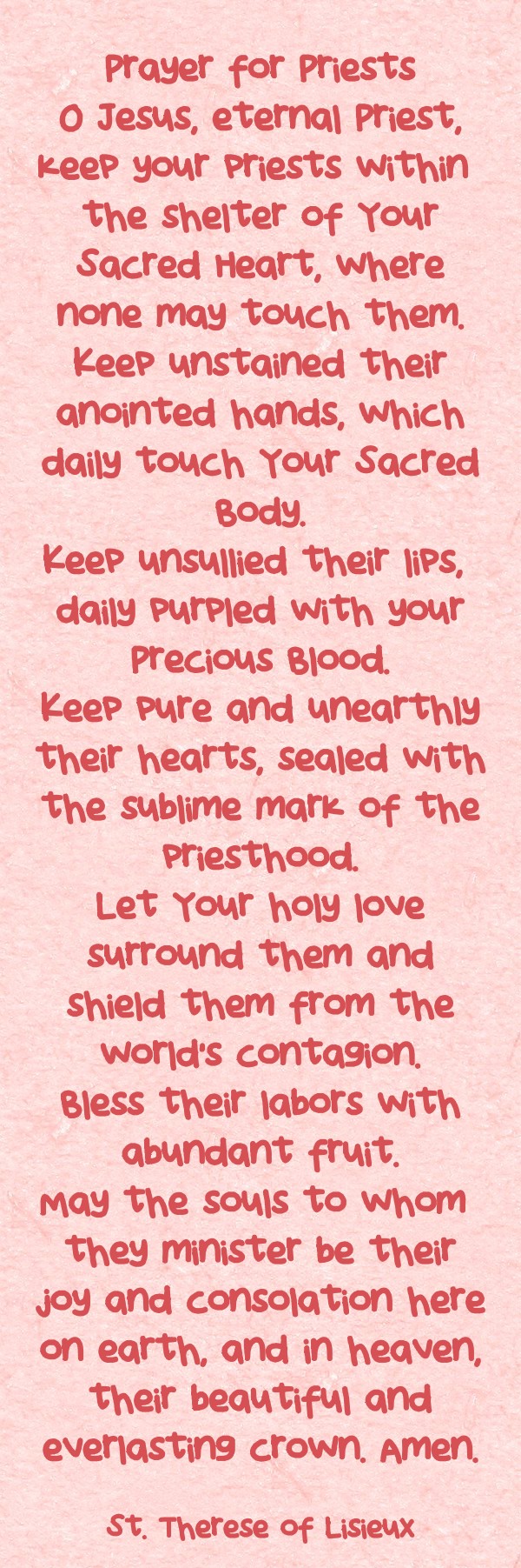 "Prayer for Priests O Jesus, eternal Priest, keep your priests within the shelter of Your Sacred Heart, where none may touch them. Keep unstained their anointed hands, which daily touch Your Sacred Body. Keep unsullied their lips, daily purpled with your Precious Blood. Keep pure and unearthly their hearts, sealed with the sublime mark of the priesthood. Let Your holy love surround them and shield them from the world’s contagion. Bless their labors with abundant fruit. May the souls to whom they minister be their joy and consolation here on earth, and in heaven, their beautiful and everlasting crown. Amen."