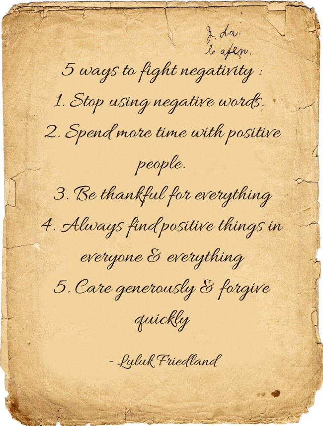 "5 ways to fight negativity : 1. Stop using negative words. 2. Spend more time with positive people. 3. Be thankful for everything 4. Always find positive things in everyone & everything 5. Care generously & forgive quickly "