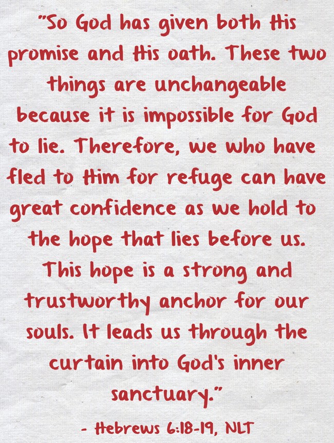 ""So God has given both His promise and His oath. These two things are unchangeable because it is impossible for God to lie. Therefore, we who have fled to Him for refuge can have great confidence as we hold to the hope that lies before us. This hope is a strong and trustworthy anchor for our souls. It leads us through the curtain into God's inner sanctuary.""
