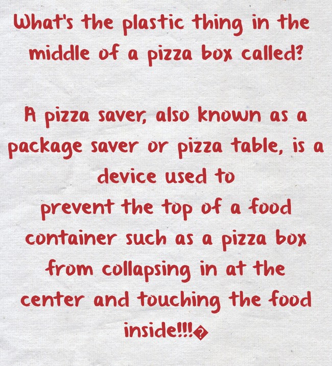 "What's the plastic thing in the middle of a pizza box called? A pizza saver, also known as a package saver or pizza table, is a device used to prevent the top of a food container such as a pizza box from collapsing in at the center and touching the food inside!!!�"