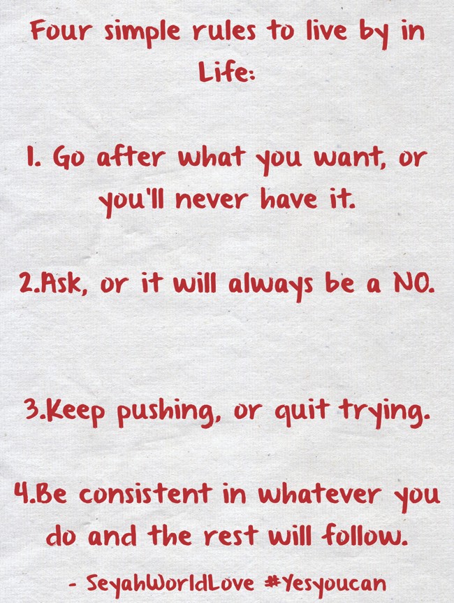 "Four simple rules to live by in Life: 1. Go after what you want, or you'll never have it. 2.Ask, or it will always be a NO. 3.Keep pushing, or quit trying. 4.Be consistent in whatever you do and the rest will follow."