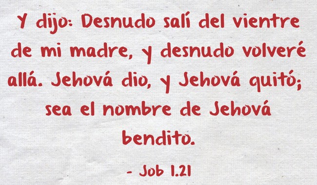 "Y dijo: Desnudo salí del vientre de mi madre, y desnudo volveré allá. Jehová dio, y Jehová quitó; sea el nombre de Jehová bendito."