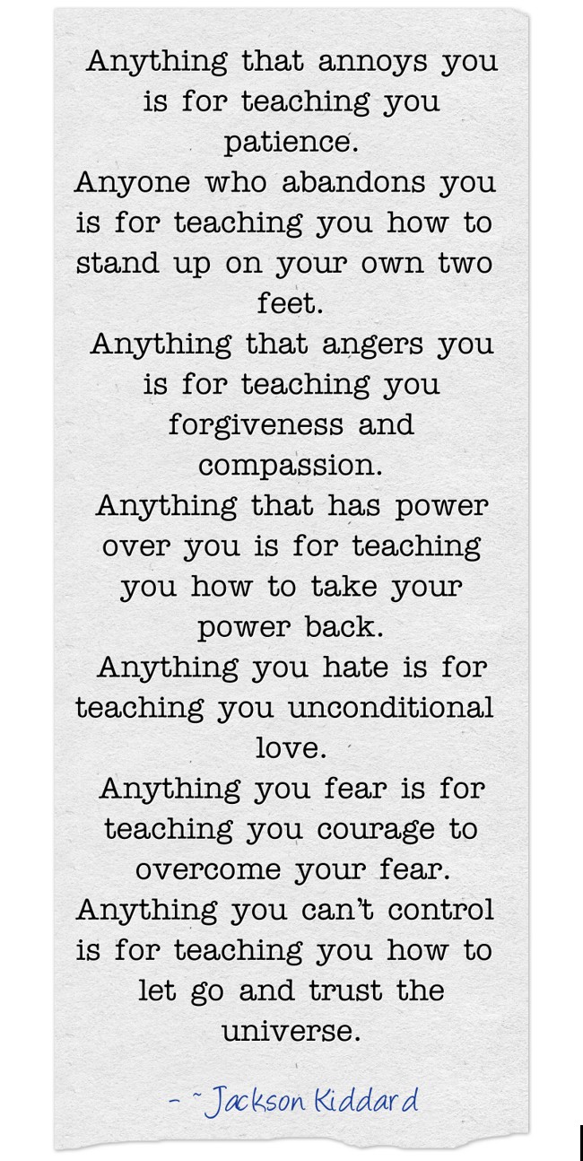 "Anything that annoys you is for teaching you patience. Anyone who abandons you is for teaching you how to stand up on your own two feet. Anything that angers you is for teaching you forgiveness and compassion. Anything that has power over you is for teaching you how to take your power back. Anything you hate is for teaching you unconditional love. Anything you fear is for teaching you courage to overcome your fear. Anything you can’t control is for teaching you how to let go and trust the universe. "