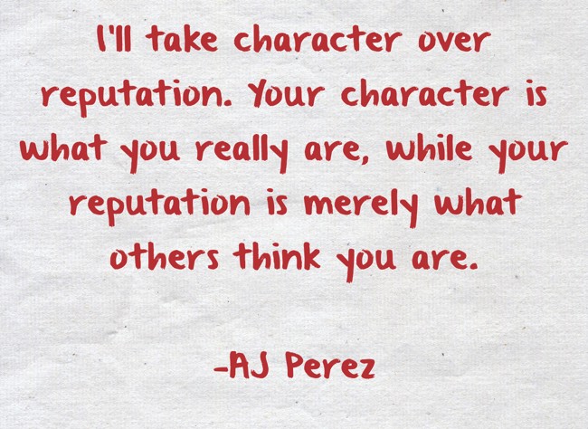 "I'll take character over reputation. Your character is what you really are, while your reputation is merely what others think you are. —AJ Perez"