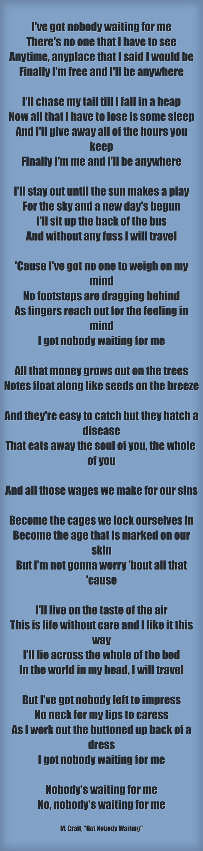 "I've got nobody waiting for me There's no one that I have to see Anytime, anyplace that I said I would be Finally I'm free and I'll be anywhere I'll chase my tail till I fall in a heap Now all that I have to lose is some sleep And I'll give away all of the hours you keep Finally I'm me and I'll be anywhere I'll stay out until the sun makes a play For the sky and a new day's begun I'll sit up the back of the bus And without any fuss I will travel 'Cause I've got no one to weigh on my mind No footsteps are dragging behind As fingers reach out for the feeling in mind I got nobody waiting for me All that money grows out on the trees Notes float along like seeds on the breeze And they're easy to catch but they hatch a disease That eats away the soul of you, the whole of you And all those wages we make for our sins Become the cages we lock ourselves in Become the age that is marked on our skin But I'm not gonna worry 'bout all that 'cause I'll live on the taste of the air This is life without care and I like it this way I'll lie across the whole of the bed In the world in my head, I will travel But I've got nobody left to impress No neck for my lips to caress As I work out the buttoned up back of a dress I got nobody waiting for me Nobody's waiting for me No, nobody's waiting for me"