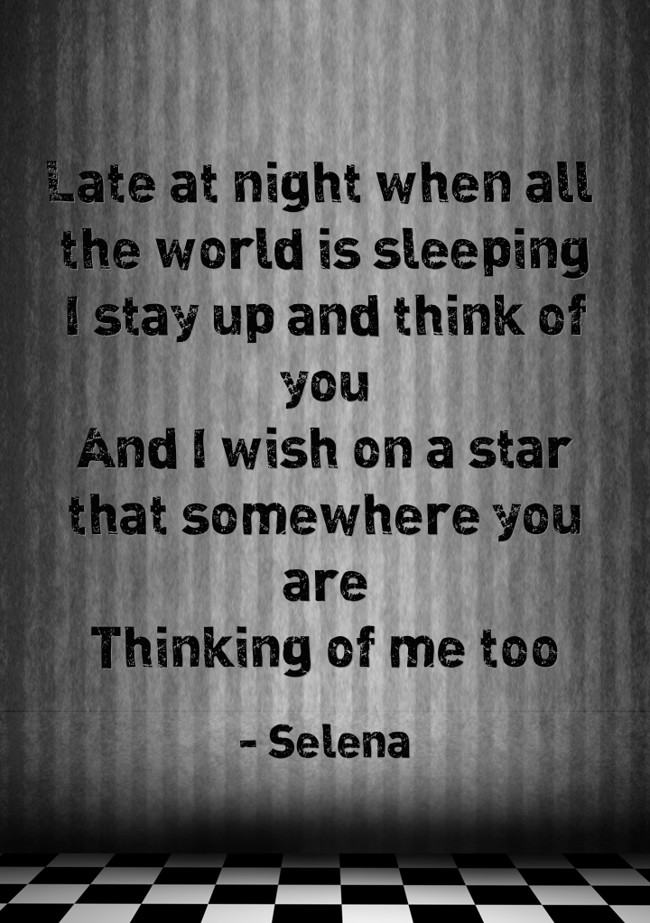 "Late at night when all the world is sleeping I stay up and think of you And I wish on a star that somewhere you are Thinking of me too"