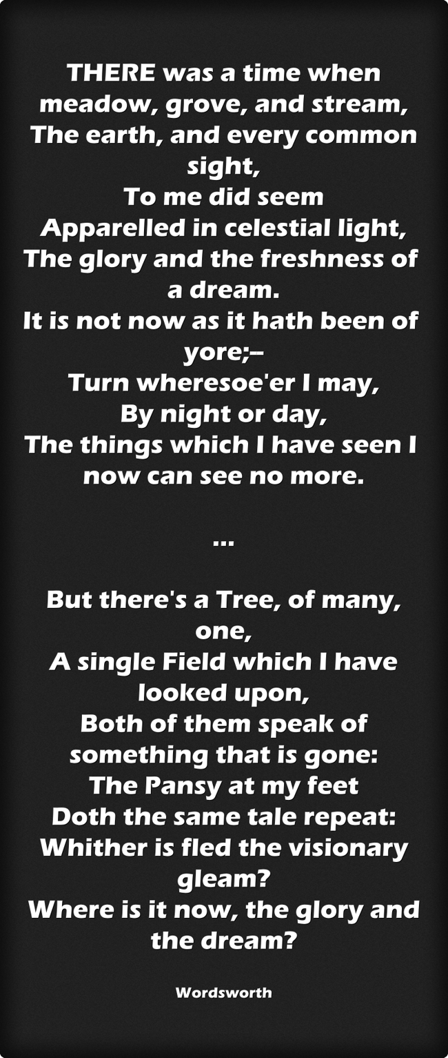 "THERE was a time when meadow, grove, and stream, The earth, and every common sight, To me did seem Apparelled in celestial light, The glory and the freshness of a dream. It is not now as it hath been of yore;-- Turn wheresoe'er I may, By night or day, The things which I have seen I now can see no more. ... But there's a Tree, of many, one, A single Field which I have looked upon, Both of them speak of something that is gone: The Pansy at my feet Doth the same tale repeat: Whither is fled the visionary gleam? Where is it now, the glory and the dream?"