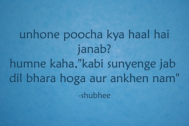 "unhone poocha kya haal hai janab? humne kaha,"kabi sunyenge jab dil bhara hoga aur ankhen nam""