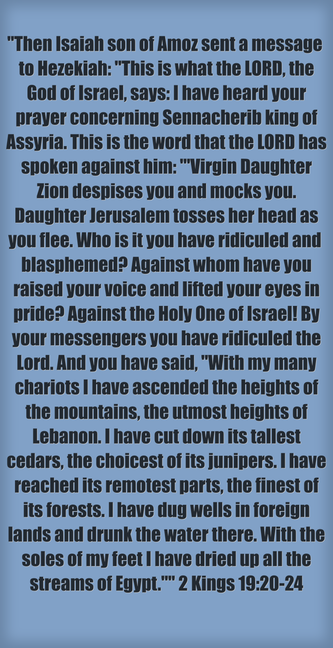 ""Then Isaiah son of Amoz sent a message to Hezekiah: "This is what the LORD, the God of Israel, says: I have heard your prayer concerning Sennacherib king of Assyria. This is the word that the LORD has spoken against him: "'Virgin Daughter Zion despises you and mocks you. Daughter Jerusalem tosses her head as you flee. Who is it you have ridiculed and blasphemed? Against whom have you raised your voice and lifted your eyes in pride? Against the Holy One of Israel! By your messengers you have ridiculed the Lord. And you have said, "With my many chariots I have ascended the heights of the mountains, the utmost heights of Lebanon. I have cut down its tallest cedars, the choicest of its junipers. I have reached its remotest parts, the finest of its forests. I have dug wells in foreign lands and drunk the water there. With the soles of my feet I have dried up all the streams of Egypt."" 2 Kings 19:20-24 "