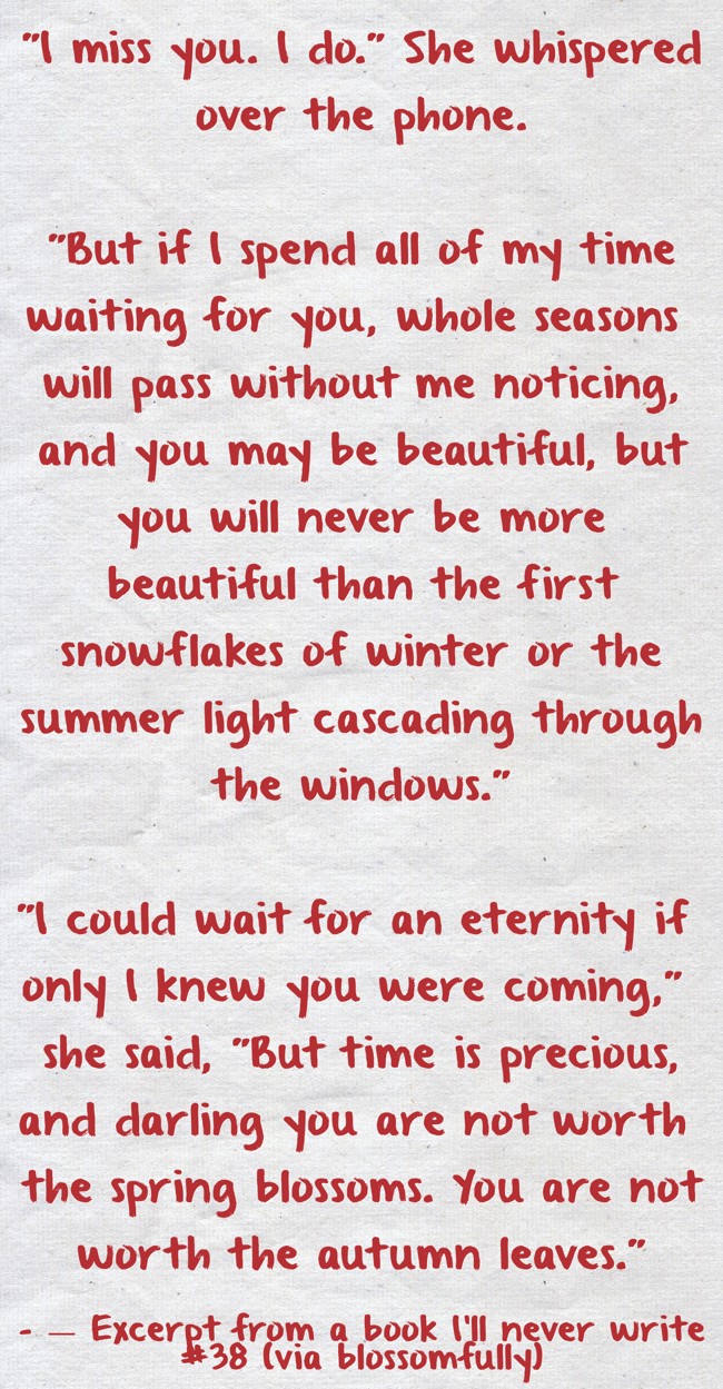 ""I miss you. I do." She whispered over the phone. "But if I spend all of my time waiting for you, whole seasons will pass without me noticing, and you may be beautiful, but you will never be more beautiful than the first snowflakes of winter or the summer light cascading through the windows." "I could wait for an eternity if only I knew you were coming," she said, "But time is precious, and darling you are not worth the spring blossoms. You are not worth the autumn leaves.""