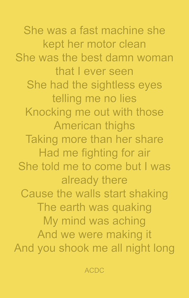 "She was a fast machine she kept her motor clean She was the best damn woman that I ever seen She had the sightless eyes telling me no lies Knocking me out with those American thighs Taking more than her share Had me fighting for air She told me to come but I was already there Cause the walls start shaking The earth was quaking My mind was aching And we were making it And you shook me all night long"