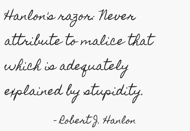 "Hanlon's razor: Never attribute to malice that which is adequately explained by stupidity."