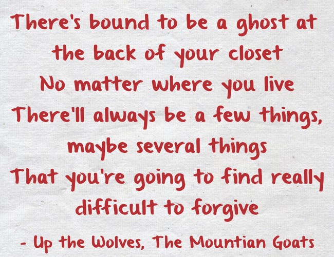 "There's bound to be a ghost at the back of your closet No matter where you live There'll always be a few things, maybe several things That you're going to find really difficult to forgive"