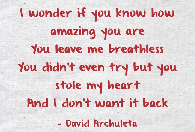 "I wonder if you know how amazing you are You leave me breathless You didn't even try but you stole my heart And I don't want it back"