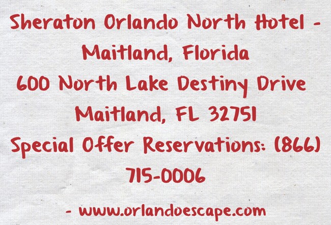 "Sheraton Orlando North Hotel - Maitland, Florida 600 North Lake Destiny Drive Maitland, FL 32751 Special Offer Reservations: (866) 715-0006"