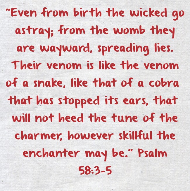 ""Even from birth the wicked go astray; from the womb they are wayward, spreading lies. Their venom is like the venom of a snake, like that of a cobra that has stopped its ears, that will not heed the tune of the charmer, however skillful the enchanter may be." Psalm 58:3-5"