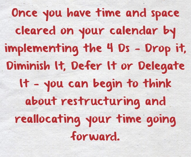 "Once you have time and space cleared on your calendar by implementing the 4 Ds — Drop it, Diminish It, Defer It or Delegate It — you can begin to think about restructuring and reallocating your time going forward."