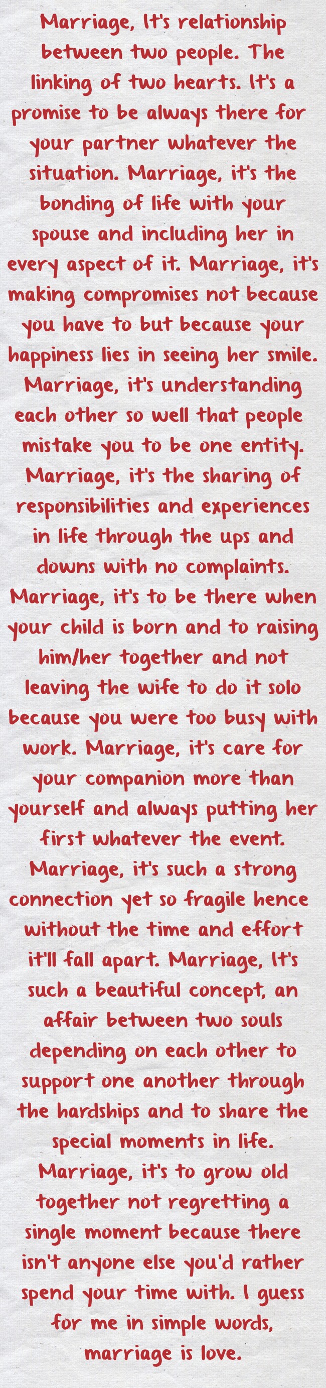 "Marriage, It's relationship between two people. The linking of two hearts. It's a promise to be always there for your partner whatever the situation. Marriage, it's the bonding of life with your spouse and including her in every aspect of it. Marriage, it's making compromises not because you have to but because your happiness lies in seeing her smile. Marriage, it's understanding each other so well that people mistake you to be one entity. Marriage, it's the sharing of responsibilities and experiences in life through the ups and downs with no complaints. Marriage, it's to be there when your child is born and to raising him/her together and not leaving the wife to do it solo because you were too busy with work. Marriage, it's care for your companion more than yourself and always putting her first whatever the event. Marriage, it's such a strong connection yet so fragile hence without the time and effort it'll fall apart. Marriage, It's such a beautiful concept, an affair between two souls depending on each other to support one another through the hardships and to share the special moments in life. Marriage, it's to grow old together not regretting a single moment because there isn't anyone else you'd rather spend your time with. I guess for me in simple words, marriage is love."