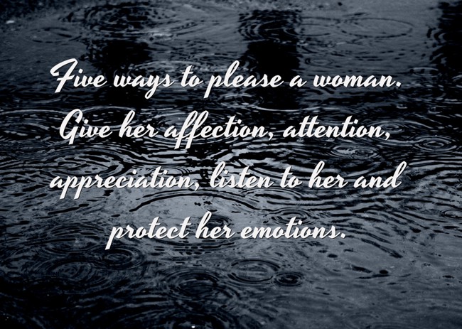 "Five ways to please a woman. Give her affection, attention, appreciation, listen to her and protect her emotions."
