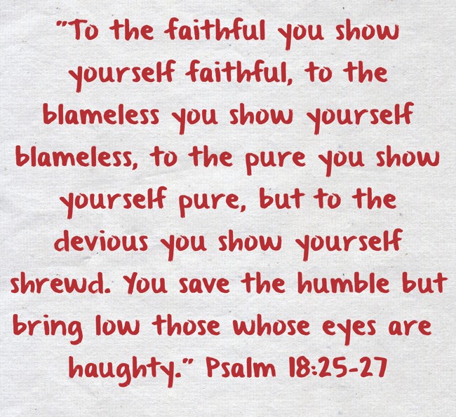 ""To the faithful you show yourself faithful, to the blameless you show yourself blameless, to the pure you show yourself pure, but to the devious you show yourself shrewd. You save the humble but bring low those whose eyes are haughty." Psalm 18:25-27 "