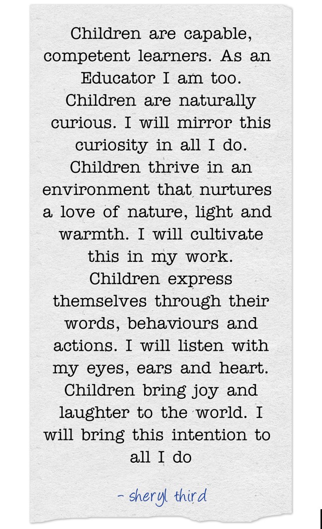 "Children are capable, competent learners. As an Educator I am too. Children are naturally curious. I will mirror this curiosity in all I do. Children thrive in an environment that nurtures a love of nature, light and warmth. I will cultivate this in my work. Children express themselves through their words, behaviours and actions. I will listen with my eyes, ears and heart. Children bring joy and laughter to the world. I will bring this intention to all I do "