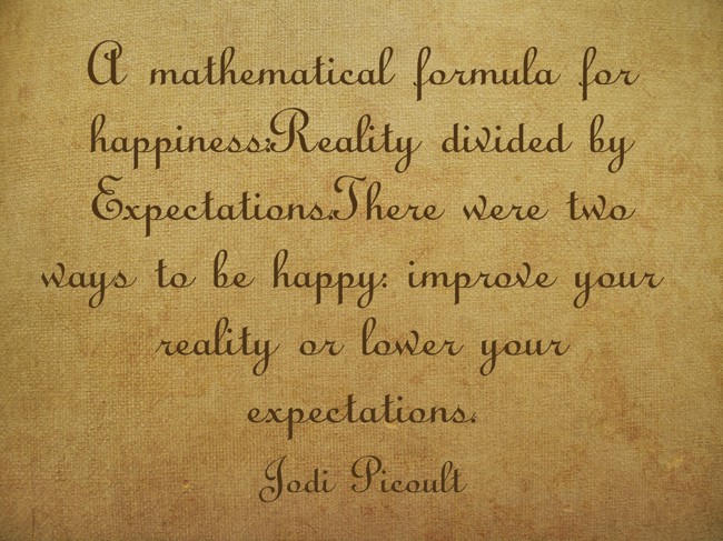 "A mathematical formula for happiness:Reality divided by Expectations.There were two ways to be happy: improve your reality or lower your expectations. "