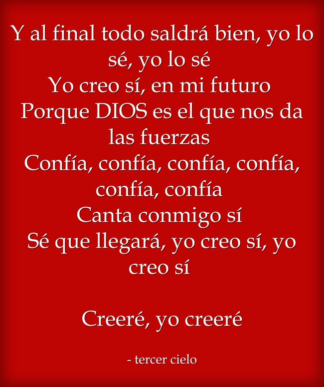 "Y al final todo saldrá bien, yo lo sé, yo lo sé Yo creo sí, en mi futuro Porque DIOS es el que nos da las fuerzas Confía, confía, confía, confía, confía, confía Canta conmigo sí Sé que llegará, yo creo sí, yo creo sí Creeré, yo creeré"