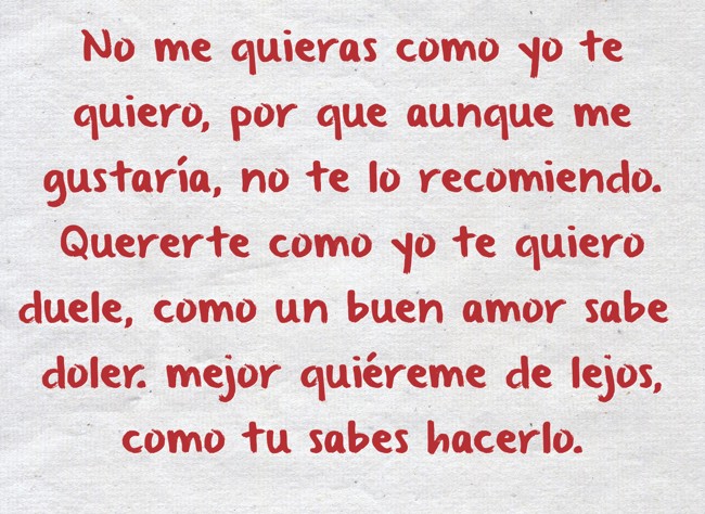 " No me quieras como yo te quiero, por que aunque me gustaría, no te lo recomiendo. Quererte como yo te quiero duele, como un buen amor sabe doler. mejor quiéreme de lejos, como tu sabes hacerlo."