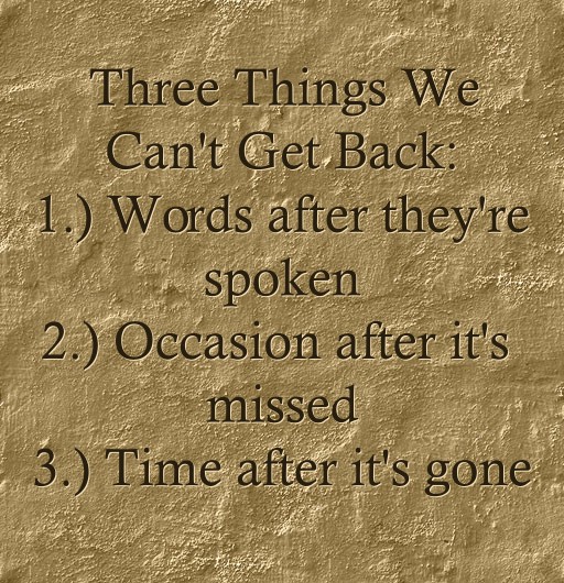 "Three Things We Can't Get Back: 1.) Words after they're spoken 2.) Occasion after it's missed 3.) Time after it's gone"