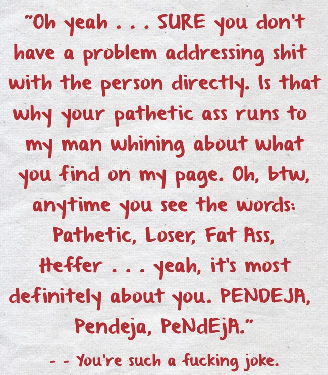 ""Oh yeah . . . SURE you don't have a problem addressing shit with the person directly. Is that why your pathetic ass runs to my man whining about what you find on my page. Oh, btw, anytime you see the words: Pathetic, Loser, Fat Ass, Heffer . . . yeah, it's most definitely about you. PENDEJA, Pendeja, PeNdEjA." "
