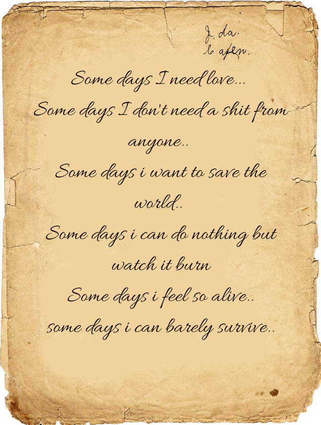 "Some days I need love... Some days I don't need a shit from anyone.. Some days i want to save the world.. Some days i can do nothing but watch it burn Some days i feel so alive.. some days i can barely survive.."