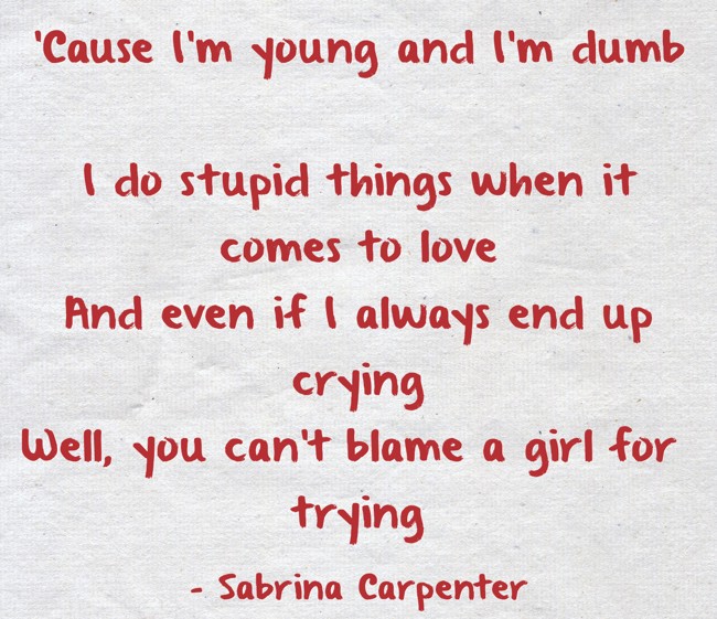 "'Cause I'm young and I'm dumb I do stupid things when it comes to love And even if I always end up crying Well, you can't blame a girl for trying "