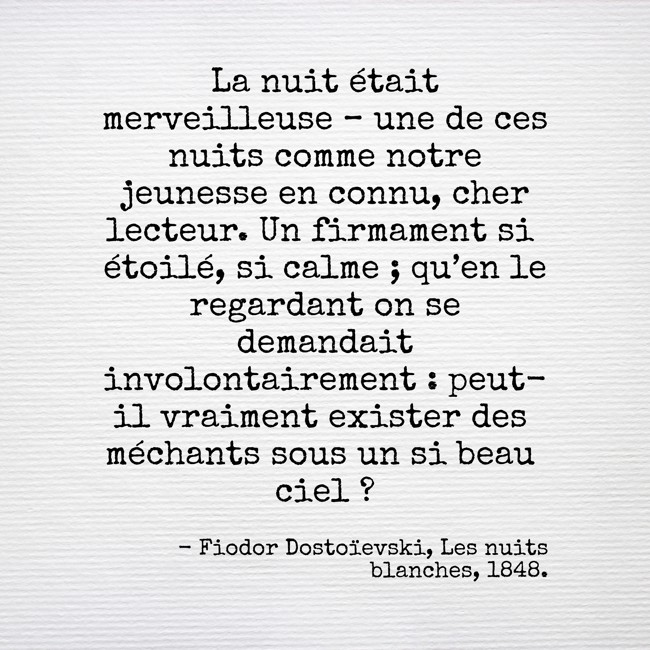 "La nuit était merveilleuse – une de ces nuits comme notre jeunesse en connu, cher lecteur. Un firmament si étoilé, si calme ; qu’en le regardant on se demandait involontairement : peut-il vraiment exister des méchants sous un si beau ciel ?"