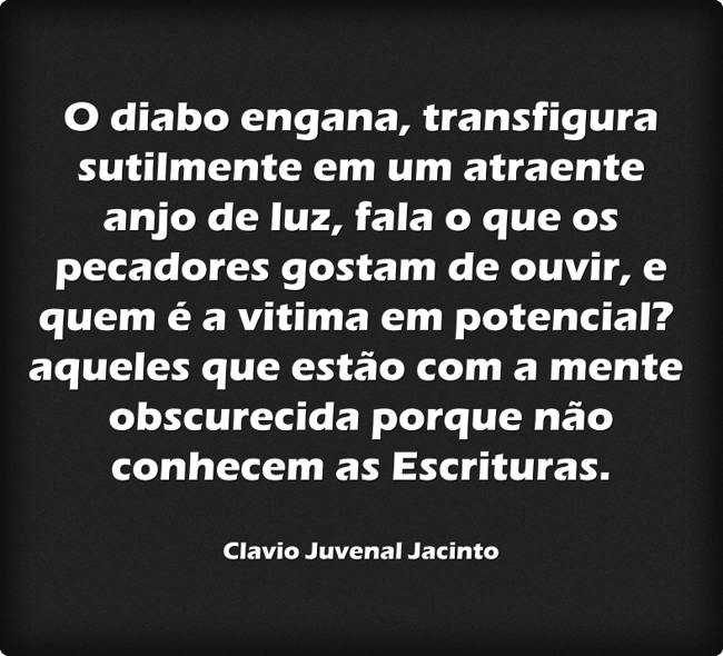 "O diabo engana, transfigura sutilmente em um atraente anjo de luz, fala o que os pecadores gostam de ouvir, e quem é a vitima em potencial? aqueles que estão com a mente obscurecida porque não conhecem as Escrituras."