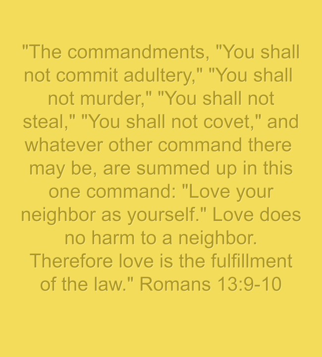 ""The commandments, "You shall not commit adultery," "You shall not murder," "You shall not steal," "You shall not covet," and whatever other command there may be, are summed up in this one command: "Love your neighbor as yourself." Love does no harm to a neighbor. Therefore love is the fulfillment of the law." Romans 13:9-10"