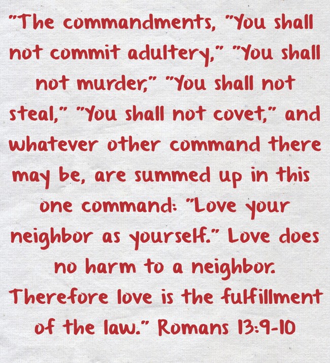 ""The commandments, "You shall not commit adultery," "You shall not murder," "You shall not steal," "You shall not covet," and whatever other command there may be, are summed up in this one command: "Love your neighbor as yourself." Love does no harm to a neighbor. Therefore love is the fulfillment of the law." Romans 13:9-10"