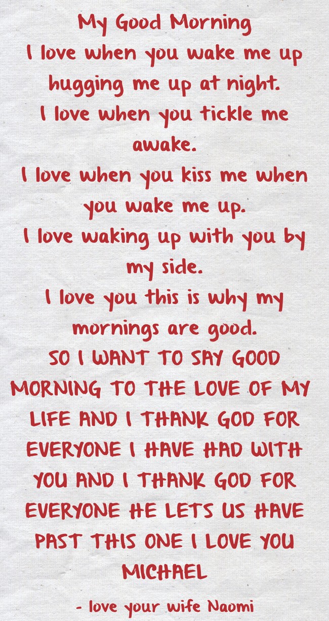 "My Good Morning I love when you wake me up hugging me up at night. I love when you tickle me awake. I love when you kiss me when you wake me up. I love waking up with you by my side. I love you this is why my mornings are good. SO I WANT TO SAY GOOD MORNING TO THE LOVE OF MY LIFE AND I THANK GOD FOR EVERYONE I HAVE HAD WITH YOU AND I THANK GOD FOR EVERYONE HE LETS US HAVE PAST THIS ONE I LOVE YOU MICHAEL"