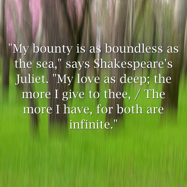 ""My bounty is as boundless as the sea," says Shakespeare's Juliet. "My love as deep; the more I give to thee, / The more I have, for both are infinite.""