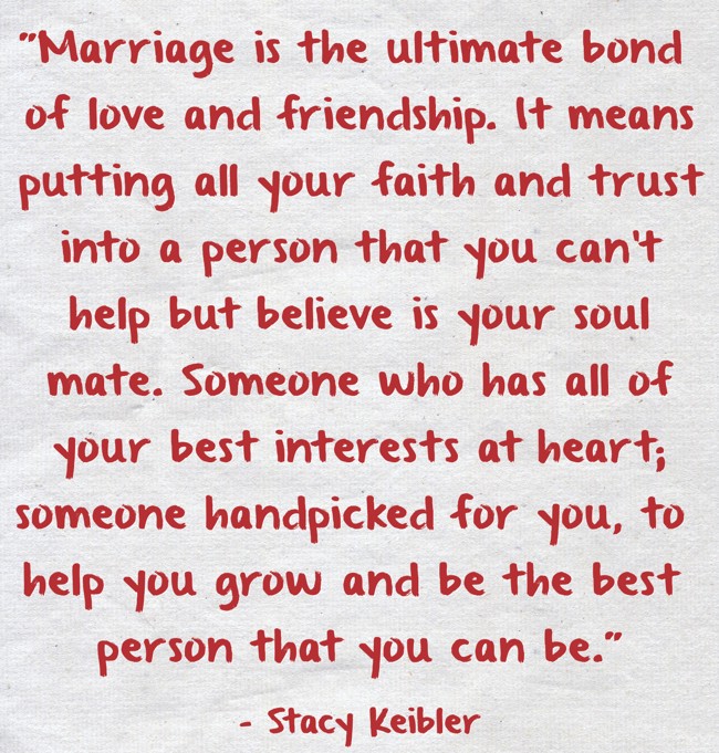 ""Marriage is the ultimate bond of love and friendship. It means putting all your faith and trust into a person that you can't help but believe is your soul mate. Someone who has all of your best interests at heart; someone handpicked for you, to help you grow and be the best person that you can be.""