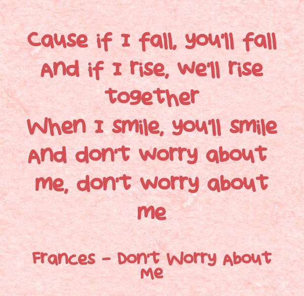 "Cause if I fall, you'll fall And if I rise, we'll rise together When I smile, you'll smile And don't worry about me, don't worry about me"