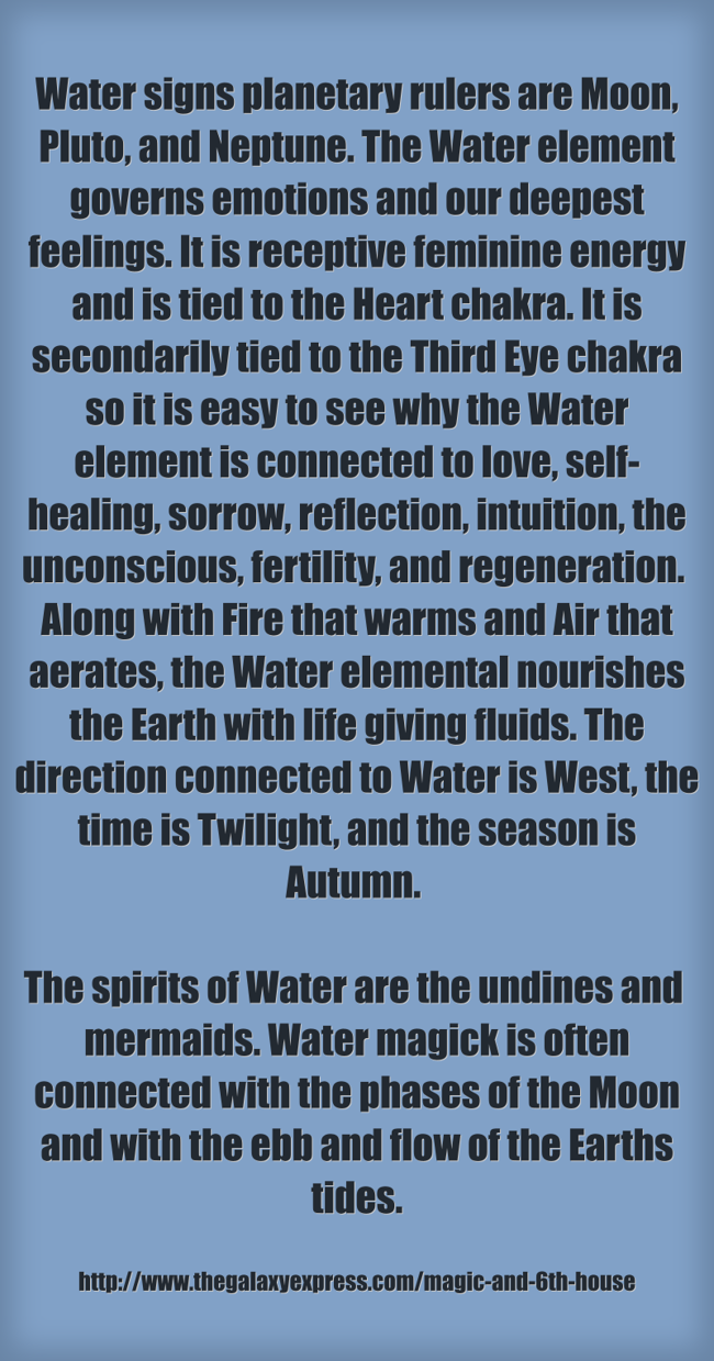 "Water signs planetary rulers are Moon, Pluto, and Neptune. The Water element governs emotions and our deepest feelings. It is receptive feminine energy and is tied to the Heart chakra. It is secondarily tied to the Third Eye chakra so it is easy to see why the Water element is connected to love, self-healing, sorrow, reflection, intuition, the unconscious, fertility, and regeneration. Along with Fire that warms and Air that aerates, the Water elemental nourishes the Earth with life giving fluids. The direction connected to Water is West, the time is Twilight, and the season is Autumn. The spirits of Water are the undines and mermaids. Water magick is often connected with the phases of the Moon and with the ebb and flow of the Earths tides."