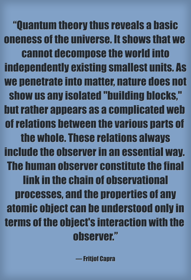 "“Quantum theory thus reveals a basic oneness of the universe. It shows that we cannot decompose the world into independently existing smallest units. As we penetrate into matter, nature does not show us any isolated "building blocks," but rather appears as a complicated web of relations between the various parts of the whole. These relations always include the observer in an essential way. The human observer constitute the final link in the chain of observational processes, and the properties of any atomic object can be understood only in terms of the object's interaction with the observer.” "