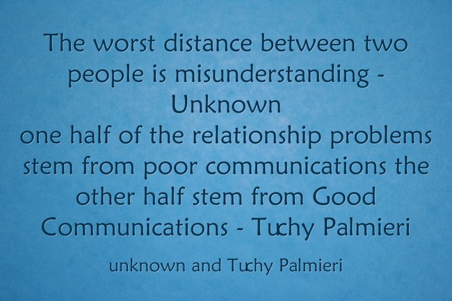 "The worst distance between two people is misunderstanding - Unknown one half of the relationship problems stem from poor communications the other half stem from Good Communications - Tuchy Palmieri"