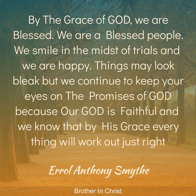 "By The Grace of GOD, we are Blessed. We are a Blessed people. We smile in the midst of trials and we are happy. Things may look bleak but we continue to keep your eyes on The Promises of GOD because Our GOD is Faithful and we know that by His Grace every thing will work out just right"